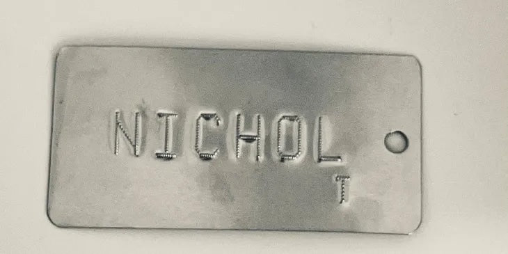 50 aluminum tags, black anodized, 2" X 1", dog tag style, laser engraved, 1 side, 1 hole